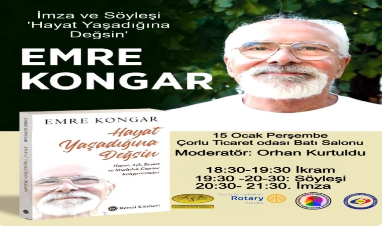 Etkinliğin maderatörlüğünü Orhan Kurtuldu üstlenecek. Program kapsamında 18.30–19.30 saatleri arasında ikram, 19.30–20.30 arasında söyleşi, 20.30–21.30 saatleri arasında ise imza bölümü yer alacak. Çorlu ABS Kültür Sanat Derneği ve Çorlu Günebakan Rotary Kulübü’nün katkılarıyla düzenlenen etkinlikte Emre Kongar, yaşam, mutluluk, başarı ve toplumsal konular üzerine değerlendirmelerde bulunacak. Söyleşi ve imza gününün yoğun ilgi görmesi bekleniyor.