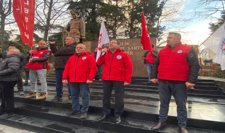 Birleşik Metal İş Sendikası Genel Başkanı Özkan Atar Atatürk Meydanı’nda yaptığı açıklamada adım adım metal işçilerinin greve gittiğini belirtti. Omurtak Caddesindeki sendika binası önünde bir araya gelen metal işçileri buradan Atatürk Meydanı’na yürüdü. Atatürk Meydanı’nda açıklama yapan Birleşik Metal İş Sendikası Genel Başkanı Özkan Atar, “Metal işçilerinin haklı ve meşru talepleri karşılanmadığı takdirde, mücadeleleri fabrika içinde ve dışında kararlılıkla sürdürülecek; grev uygulaması da dahil olmak üzere gerekli adımlar tereddütsüz biçimde hayata geçirilecektir. Bundan kimsenin kuşkusu olmasın. Bu mücadelede kazanan metal işçileri olacaktır” ifadelerine yer verdi.