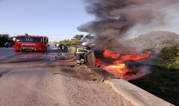 Yaşanan tek taraflı kazada 39 ABP 347 plakalı tırda yangın başladı ve olay yerine gelen itfaiye ekipleri yangını söndürdü.